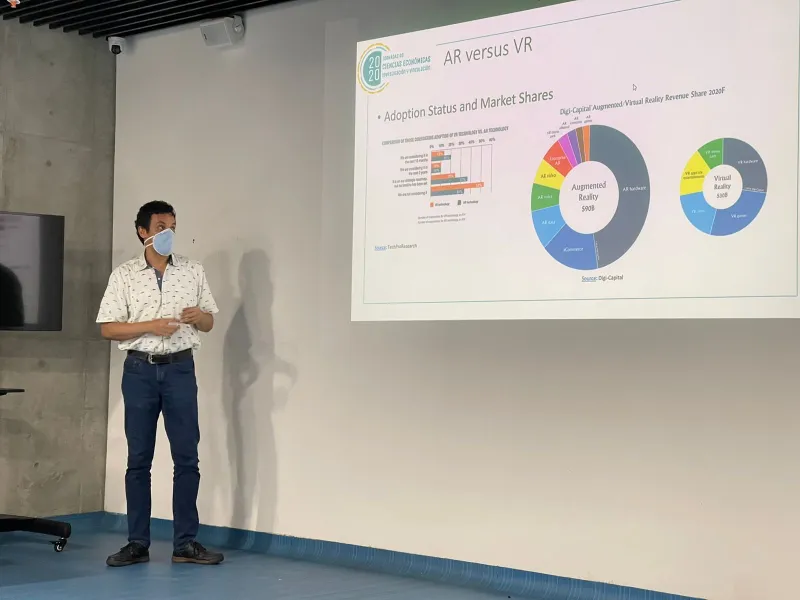 El tallerista compartió algunos conceptos claves: inició con ‘realidad’, luego ‘realidad aumentada’, ‘virtualidad aumentada’ y, finalmente, ‘virtualidad’. Además, presentó la idea del metaverso y cómo este debería complementar el mundo real, y no sustituirlo. De este modo, al desarrollar dicho mundo virtual, no se desatienden los problemas del mundo real, sino que se buscan soluciones a partir del encuentro entre ambos mundos.